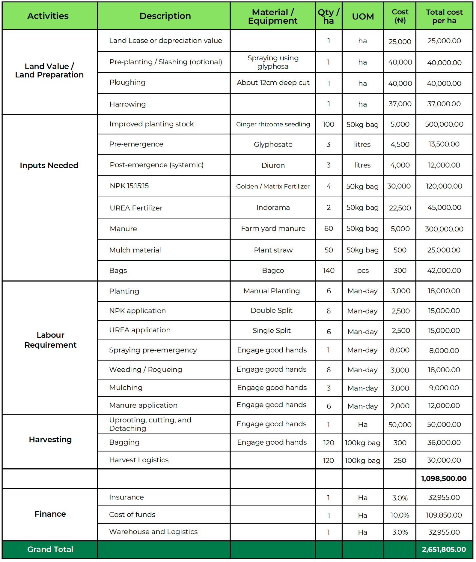 It is advised that capital expenditure is avoided at this stage and all capabilities are sourced as services. Labour and services costs may vary per state or region and are amortized per hectare.